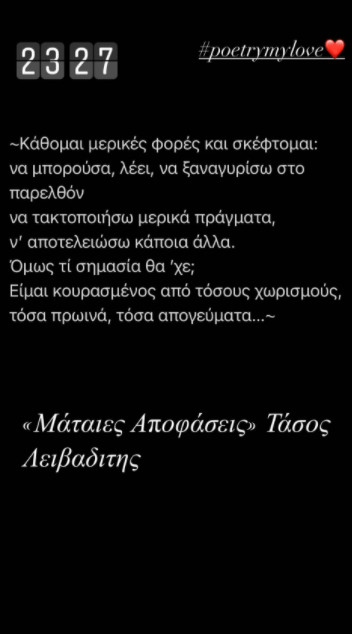 Η Κατερίνα Καινούργιου, λοιπόν, έκανε ένα Insta story χρησιμοποιώντας στίχους από to ποίημα του Τάσου Λειβαδίτη “Mάταιες Αποφάσεις”, ενώ μάλιστα έβαλε το hashtag #poetrymylove.