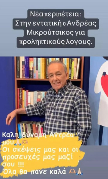 Η παρουσιάστρια της εκπομπής “Super Katerina” ανάρτησε σε story της ένα δημοσίευμα με την είδηση για την υγεία του Ανδρέα Μικρούτσικου και έγραψε: «Καλή δύναμη Αντρέα μου. Οι σκέψεις μας και οι προσευχές μας μαζί σου. Όλα θα πάνε καλά».