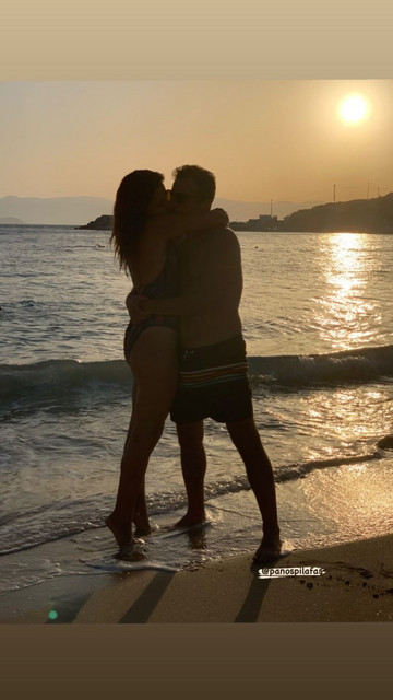 Πιο συγκεκριμένα, η Κατερίνα Παπουτσάκη δημοσίευσε στον προσωπικό της λογαριασμό στο Instagram ένα πλάνο από τις βουτιές της. Η ίδια και ο σύζυγός της Παναγιώτης Πιλαφάς είναι αγκαλιασμένοι και μοιράζονται ένα γλυκό φιλί, με φόντο την θάλασσα και το ηλιοβασίλεμα.