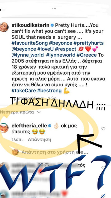 Η ειρωνική κατά πολλούς απάντηση της Ελευθερίας Ελευθερίου δεν άργησε να έρθει γράφοντας ως σχόλιο (προκαλώντας έκπληξη στην τραγουδίστρια): “Οκ… μας έπεισες!”, με την Κατερίνα Στικούδη να μην πιστεύει στα μάτια της και να σχολιάζει σε story κυκλώνοντας το σχόλιο “Τί φάση;” Η ίδια ήθελε να υπερθεματίσει το γεγονός αφού δεν πίστευε ότι η Ελευθερία Ελευθερίου προέβη σε τέτοιο σχόλιο.