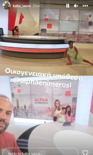 Η Κάτια Σάββα βρέθηκε σήμερα στις εγκαταστάσεις του καναλιού και έκανε τις τελευταίες πρόβες πριν την μεγάλη πρεμιέρα της εκπομπής της, Alpha Ενημέρωση στις 11:00. Στο πλευρό της, ήταν και οι δύο κόρες της με τον σύζυγό της.
