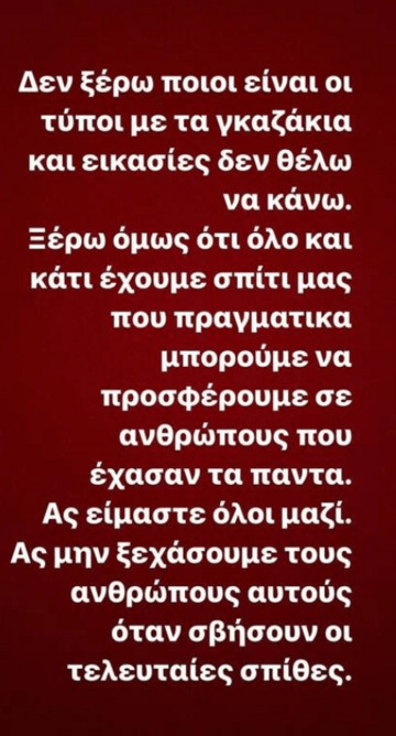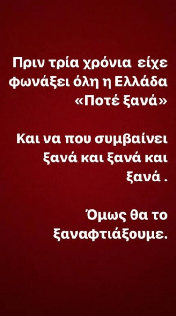 “Δεν ξέρω γιατί συμβαίνει όλο αυτό. Αυτό που ξέρω είναι ότι θα το ξαναφτιάξουμε. Όλοι μαζί. Να πηγαίνουν όλα τα σχολεία για αναδάσωση. Κάθε μέρα. Τι να την κάνουν τη μόρφωση αν δεν υπάρχει ζωή γύρω τους; Δεν ξέρω ποιοι είναι οι τύποι με τα γκαζάκια και εικασίες δε θέλω να κάνω. Ξέρω όμως ότι όλο και κάτι έχουμε στο σπίτι μας που πραγματικά μπορούμε να προσφέρουμε σε ανθρώπους που έχασαν τα πάντα. Ας είμαστε όλοι μαζί. Ας μη ξεχάσουμε τους ανθρώπους που έχασαν τα πάντα όταν σβήσουν οι τελευταίες σπίθες. Πριν τρία χρόνια είχε φωνάξει όλη η Ελλάδα, “Ποτέ ξανά”. Και να που συμβαίνει ξανά και ξανά και ξανά. Όμως θα το ξαναφτιάξουμε”.