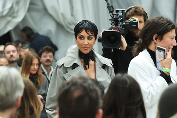Η διάσημη τηλεπερσόνα κάθισε στην πρώτη σειρά του σόου φορώντας μία γκρι καπαρντίνα και ένα μαύρο μαντήλι δεμένο γύρω από τον λαιμό της. Δίπλα της βρισκόταν η αδερφή της, Κάιλι Τζένερ, η οποία προτίμησε ένα διάφανο λευκό μίνι φόρεμα.