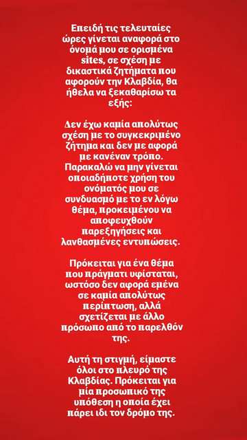 Από την πλευρά της, η Klavdia φέρεται να εξετάζει σοβαρά τις επόμενες νομικές της κινήσεις, αφήνοντας ανοιχτό το ενδεχόμενο να απαντήσει με δική της μήνυση ή αγωγή κατά του πρώην συντρόφου της. Η υπόθεση παραμένει ανοιχτή και αναμένεται να απασχολήσει το επόμενο διάστημα, με την τελική της έκβαση να κρίνεται στις δικαστικές αίθουσες.