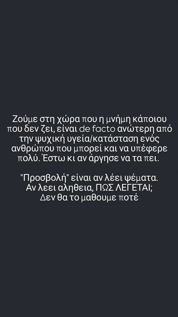 Ο Λάμπρος Κωνσταντάρας λοιπόν, μέσω story του στο Instagram έγραψε χαρακτηριστικά: «Ζούμε στη χώρα που η μνήμη κάποιου που δεν ζει, είναι de facto ανώτερη από την ψυχική υγεία/κατάσταση ενός ανθρώπου που μπορεί και να υποφέρει πολύ. Έστω κι αν άργησε να το πει. “Προσβολή” είναι αν λέει ψέματα. Αν λέει αλήθεια, ΠΩΣ ΛΕΓΕΤΑΙ; Δεν θα μάθουμε ποτέ».