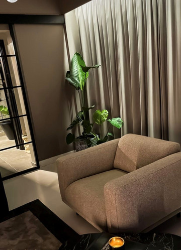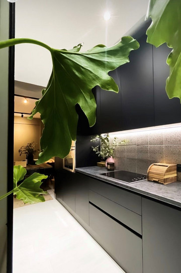 Στο σαλόνι της όπως θα δεις είναι σε μίνιμαλ γραμμές, κυριαρχούν οι γήινες και οι γκρι αποχρώσεις με μια relax πολυθρόνα και ένα μαρμάρινο τραπεζάκι να ξεχωρίζουν. Στο ίδιο ύφος είναι και η κουζίνα της αφού κυριαρχεί το μαύρο χρώμα.