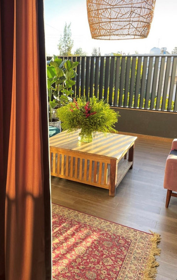 Ενώ, όσον αφορά το μπαλκόνι της, η Κωνσταντίνα προτίμησε να το διακοσμήσει με ξύλο και να δώσει μια boho νότα με ένα κόκκινο χαλί.