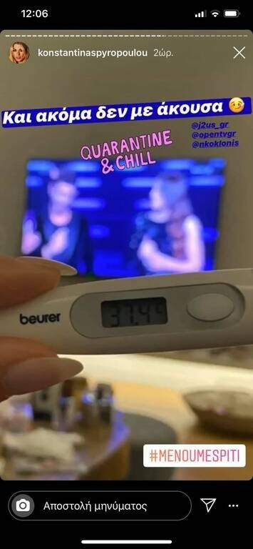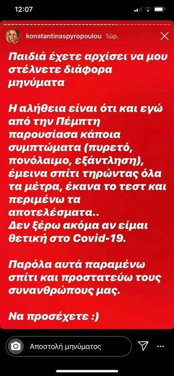 H Κωνταντίνα Σπυροπούλου μας ενημέρωσε μέσω του προσωπικού της λογαριασμού στο Instagram, ότι εδώ και μέρες είναι ολίγον αρρωστούλα, με πυρετό, πονόλαιμο και κόπωση, πράγμα το οποίο την ανησύχησε πολύ ενόψει της εξάπλωσης του κορωνοϊού.