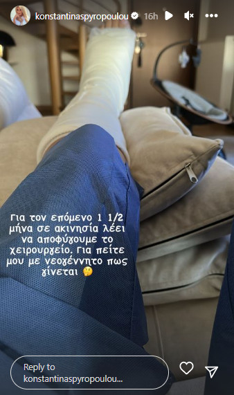Συγκεκριμένα, δημοσίευσε μία φωτογραφία στην οποία φαίνεται το πόδι της με τον γύψο. Λίγες ώρες μετά, η Κωνσταντίνα Σπυροπούλου επέστρεψε στο σπίτι της, ενώ για το επόμενο διάστημα θα πρέπει να μείνει σε ακινησία, προκειμένου να αποφύγει το χειρουργείο.