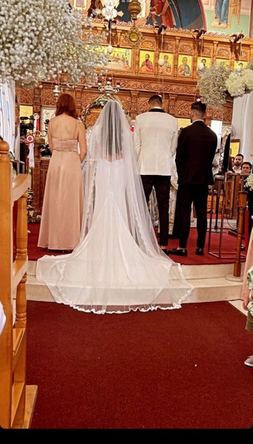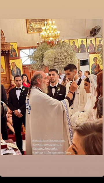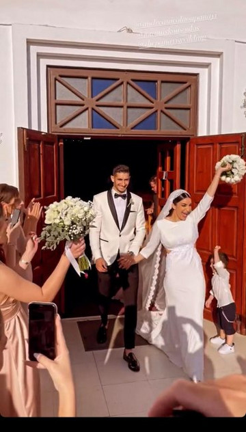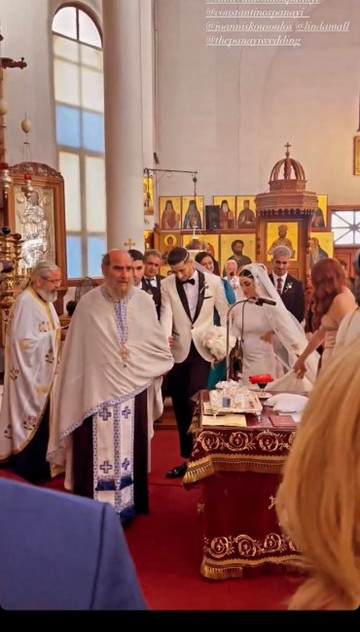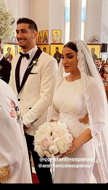 Η νύφη επέλεξε ένα μίνιμαλ λευκό σατέν νυφικό της Κύπριας σχεδιάστριας Έφης Παπαϊωάννου, που ξεχώριζε για τα σέξι cut-outs του ενώ το look της ολοκληρώνει ένα λευκό headband στα μαλλιά.