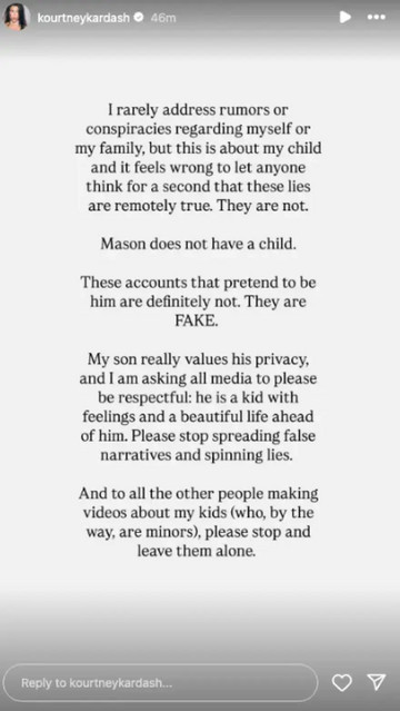 Η τηλεπερσόνα και influencer, έχοντας αγανακτήσει από τη συνεχιζόμενη διάδοση ψευδών ειδήσεων, έγραψε στον προσωπικό της λογαριασμό στο Instagram: «Σπάνια σχολιάζω φήμες ή θεωρίες συνωμοσίας για εμένα και την οικογένειά μου, αλλά αυτή τη φορά αφορά το παιδί μου και αισθάνομαι ότι είναι λάθος να αφήσω οποιονδήποτε να πιστέψει, έστω και για ένα δευτερόλεπτο, ότι αυτά τα ψέματα είναι αληθινά. Δεν είναι». Η ίδια ξεκαθάρισε ότι ο Μέισον δεν έχει παιδί και πως όλοι οι λογαριασμοί που παριστάνουν ότι είναι εκείνος είναι ψεύτικοι.