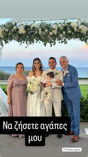 Ο γάμος τελέστηκε στον Πρωταρά, σε μια παραθαλάσσια τελετή, όπου έδωσαν το παρών συγγενείς, φίλοι αλλά και οι στενοί κύκλοι της οικογένειας. Ο ηθοποιός δεν έκρυψε τη συγκίνησή του, ποζάροντας ευτυχισμένος δίπλα στο νεόνυμφο ζευγάρι και το εγγονάκι του, το οποίο κρατούσε στην αγκαλιά του ο γαμπρός.