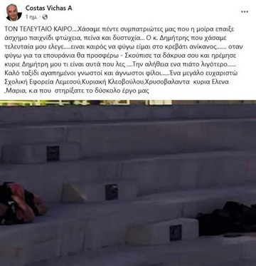 Με λόγια γεμάτα συγκίνηση και αγάπη, ο Κύπριος ηθοποιός Κώστας Βήχας αποχαιρέτησε έναν άστεγο συμπολίτη μας που έφυγε πρόσφατα από τη ζωή.