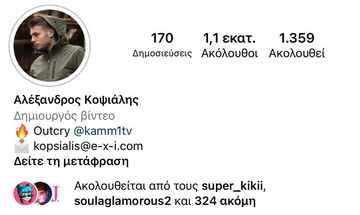 Το instagram του αρχίζει να αποδυναμώνεται αφού πλέον δεν είναι ο influencer με τους περισσότερους ακόλουθους στην Ελλάδα αφού οι 1,2 εκατομμύρια ακόλουθοι έπεσαν και έγιναν 1,1 (δηλαδή η ένδειξη δείχνει 100.000 πιο κάτω).