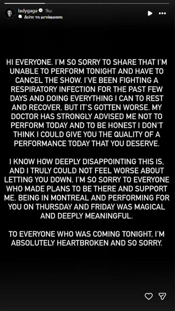 Την τελευταία στιγμή ακύρωσε η Lady Gaga συναυλία της λόγω αναπνευστικής λοίμωξης, εκφράζοντας τη λύπη της για την εξέλιξη αυτή.