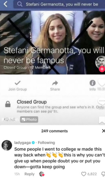 Τότε, μερικοί από τους συμφοιτητές της είχαν δημιουργήσει ένα ιδιωτικό γκρουπ στο Facebook με τίτλο «Στέφανι Τζερμανότα, δεν θα γίνεις ποτέ διάσημη», συνοδευόμενο από μια παλιά φωτογραφία της σούπερ σταρ. Το Στέφανι Τζερμανότα είναι το πραγματικό όνομα της Gaga.