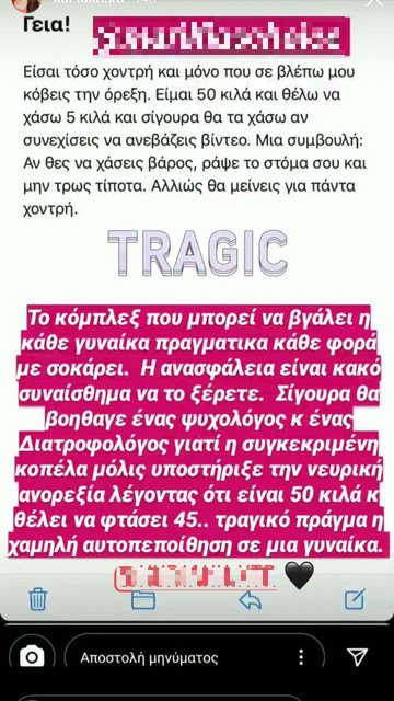Μία γυναίκα ανεξάρτητα από τα κιλά και το σωματότυπο της μπορεί να αισθάνεται όμορφα για τον εαυτό της και να έχει την αυτοπεποίθηση που χρειάζεται και να εκφράζει τη θηλυκότητα της. Αρνητικά σχόλια για τα κιλά της δέχθηκε η Λουκία Κυριάκου από μία ακόλουθο της στο instagram. Συγκεκριμένα, το μήνυμα που της έστειλε έγραφε, «Είσαι τόσο χοντρή και μόνο που σε βλέπω μου κόβεις την όρεξη. Είμαι 50 κιλά και θέλω να χάσω 5 κιλά και σίγουρα θα τα χάσω αν συνεχίσει να ανεβάζεις βίντεο. Μια συμβουλή: Αν θες να χάσεις βάρος, ράψε το στόμα σου και μην τρως τίποτα. Αλλιώς θα μείνεις για πάντα χοντρή».