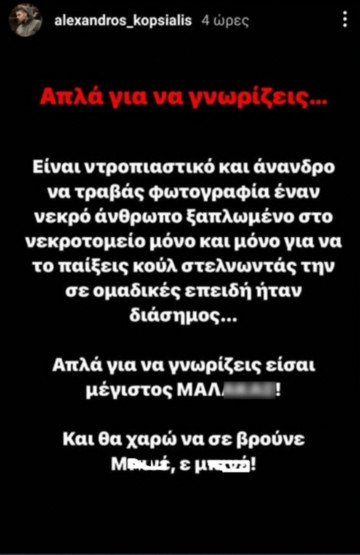 Ο ίδιος με ανάρτησή του στο Instagram αναφέρει: «Απλά για να γνωρίζεις… Είναι ντροπιαστικό και άνανδρο να τραβάς φωτογραφία έναν νεκρό άνθρωπο, ξαπλωμένο στο νεκροτομείο, μόνο και μόνο για να το παίξεις κουλ, στέλνοντάς την σε ομαδικές (συνομιλίες), επειδή ήταν διάσημος! Απλά για να γνωρίζεις, είσαι μέγιστος μλκς! Και θα χαρώ να σε βρούνε. Μπ…, ε μπ…!».