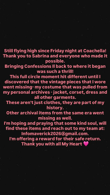 «Πετάω ακόμα ψηλά από την Παρασκευή το βράδυ στο Coachella! Ευχαριστώ τη Sabrina και όλους όσους το έκαναν δυνατό. Το να επαναφέρω το Confessions II εκεί που ξεκίνησε ήταν τόσο συναρπαστικό. Αυτή η στιγμή ήταν ξεχωριστή μέχρι που ανακάλυψα ότι τα vintage κομμάτια που φορούσα είχαν χαθεί – η στολή μου που ανέσυρα από το προσωπικό μου αρχείο – το σακάκι, ο κορσές, το φόρεμα και όλα τα άλλα ρούχα. Αυτά δεν είναι απλώς ρούχα, είναι μέρος της ιστορίας μου. Άλλα αρχειακά αντικείμενα από την ίδια εποχή χάθηκαν επίσης.