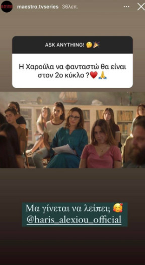 Ανάμεσα στις ερωτήσεις που δέχτηκε η επίσημη σελίδα του “Maestro” στο Instagram ήταν και αυτή σχετικά με το εάν θα δούμε τη Χαρούλα Αλεξίου στη δεύτερη σεζόν της σειράς του Χριστόφορου Παπακαλιάτη.