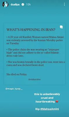 Από εκείνη την ημέρα έντονές διαδηλώσεις διαμαρτυρίας πραγματοποιούνται στο Ιράν άλλα και σε άλλα σημεία του πλανήτη. Παράλληλα celebrities αποτίνουν φόρο τιμής στη Mahsa Amini μέσα από τα social media. Ανάμεσα τους η Bella Hadid, η Dua Lipa, η τραγουδίστρια Halsey.