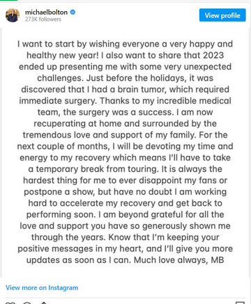 Με ανάρτησή του στα social media ο Μάικλ Μπόλτον αποκάλυψε ότι διαγνώστηκε με όγκο στον εγκέφαλο πριν από τις διακοπές των γιορτών.