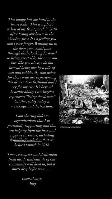 “Περπατώντας μέχρι την πόρτα που θα περνούσες καθημερινά, ανυπομονώντας να σε υποδεχτούν αυτοί που αγαπάς όπως κάνεις πάντα, αλλά αντί γι’ αυτό να σε συναντήσει ένας σωρός από στάχτη και ερείπια“, συνέχισε. “Η ψυχή μου πονάει για όσους βιώνουν αυτή την καταστροφή από πρώτο χέρι και κλαίω για την πόλη μου. Είναι πέρα από το σπαρακτικό. Το Los Angeles αντιπροσωπεύει το “να ζεις το όνειρο”, αλλά η πραγματικότητα σήμερα είναι συντρίμμια και καταστροφή“.