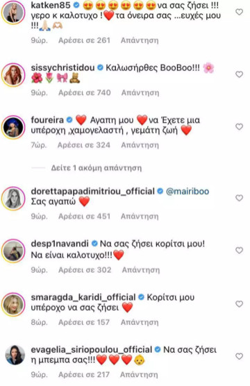 Η Ελένη Φουρέιρα, που περιμένει κι εκείνη το μωράκι της, της ευχήθηκε «Αγάπη μου. Να έχετε μια υπέροχη, χαμογελαστή, γεμάτη ζωή» ενώ η Κατερίνα Καινούργιου έγραψε «Να σας ζήσει! Γερό και καλότυχο! Τα όνειρά σας… ευχές μου!».