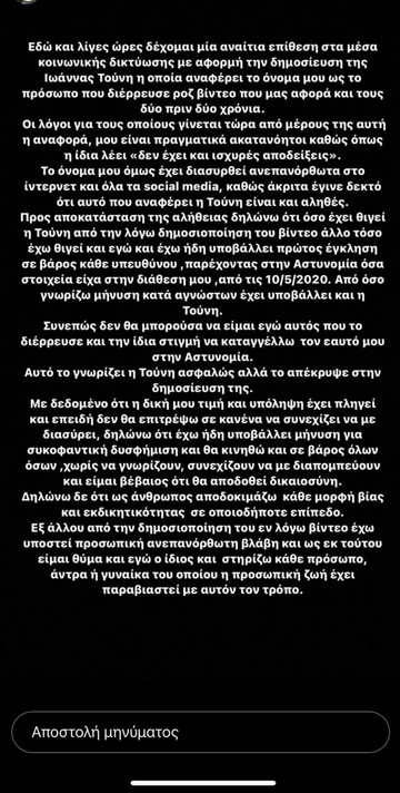 Μάλιστα όπως σημειώνει: “Το όνομα μου έχει διασυρθεί ανεπανόρθωτα στο ίντερνετ και στα social media, καθώς άκριτα έγινε δεκτό ότι αυτό που αναφέρει η Τούνη είναι αληθές… Συνεπώς δεν θα μπορούσα να είμαι εγώ αυτός που διέρρευσε το βίντεο”
