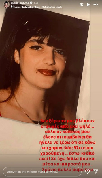 «Δεν ξέρω αν μας βλέπουν οι ψυχές από εκεί ψηλά… αλλά αν κάποιος μου έλεγε ότι συμβαίνει, θα ήθελα να ξέρω ότι σε κάνω να χαμογελάς! Ότι είσαι χαρούμενη… έστω κι από εκεί! Σε έχω δίπλα μου και μέσα και μπροστά μου. Χρόνια πολλά μαμά μου», έγραψε η Μαρία Αντωνά.