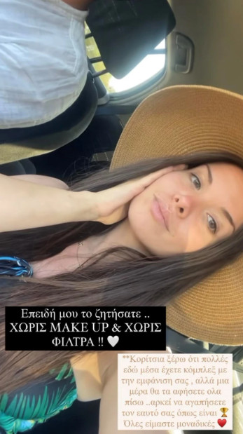 Για τους ακολουθούς της, ωστόσο, η Μαρία Μπέη παρενέβη τον «κανόνα» της και έγραψε: «Επειδή μου το ζητήσατε… Χωρίς makeup και χωρίς φίλτρα. Κορίτσια ξέρω ότι πολλές εδώ μέσα έχετε κόμπλεξ με την εμφάνισή σας, αλλά μια μέρα θα τα αφήσετε όλα πίσω… αρκεί να αγαπήσετε τον εαυτό σας όπως είναι. Όλες είμαστε μοναδικές».