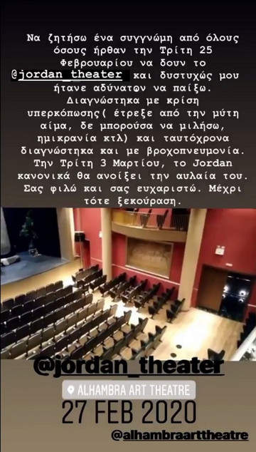 Nα ζητήσω ένα συγγνώμη απ’ όλους όσους ήρθαν την Τρίτη 25 Φεβρουαρίου να δουν το @jordan_theater και δυστυχώς μου ήταν αδύνατον να παίξω. Διαγνώστηκα με κρίση υπερκόπωσης (έτρεξε από τη μύτη μου αίμα, δεν μπορούσα να μιλήσω, ημικρανία κτλ) και ταυτόχρονα διαγνώστηκα με βραχοπνευμονία. Την Τρίτη 3 Μαρτίου το Jordan κανονικά θα ανοίξει την αυλαία του. Σας φιλώ και σας ευχαριστώ. Μέχρι τότε ξεκούραση