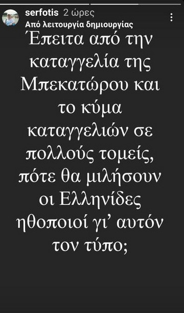 “Νομίζω ξέρω σε ποιον αναφέρονται. Εμένα δε μου έχει συμβεί κάτι. Έχω ακούσει ποιος θα μπορούσε να είναι και γνωρίζω ποιες γυναίκες. Είναι ονόματα πρώτης γραμμής και είναι σεξουαλική παρενόχληση. Τώρα ίσως δεν έχουν πρόβλημα να μιλήσουν για να φοβούνται για την καριέρα τους. Τότε; Είναι άνθρωπος που τον θαυμάζουμε. Εγώ μόνο ό,τι έχω ακούσει, που έχουμε ακούσει.