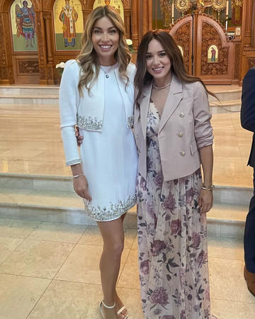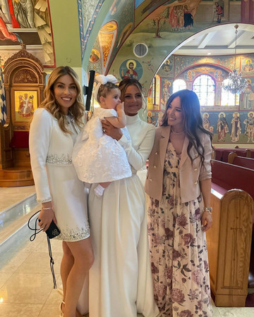 Η Μαρία Μενούνος επέλεξε ένα μάξι μακρυμάνικο φόρεμα και λευκό χρώμα που ταίριαζε απόλυτα με το βαφτιστικό φόρεμα της μικρής. Από την άλλη, η Καλομοίρα, πόνταρε σε ένα floral maxi φόρεμα που το συνδύασε άψογα με ένα blazer σακάκι σε nude απόχρωση. Η Μαριέττα Χρουσαλά, κινήθηκε στο ίδιο ‘μοτίβο’ με τη μητέρα της μικρής και προτίμησε ένα λευκό mini φόρεμα με ασημένιες λεπτομέρεις στο τελείωμα του και το σέταρε με ασορτί σακάκι από πάνω.