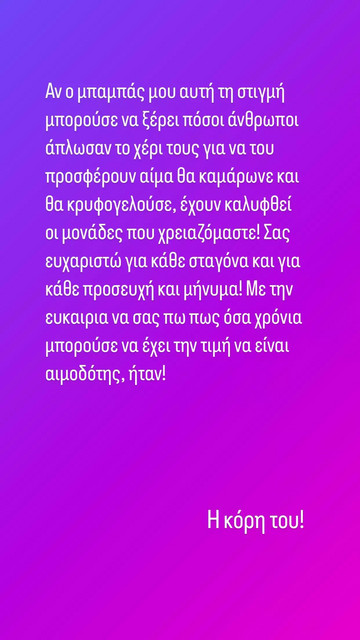 Μόλις μια μέρα νωρίτερα, η ηθοποιός είχε απευθύνει δημόσια έκκληση μέσω Instagram ζητώντας επειγόντως αίμα για τον πατέρα της, ο οποίος παλεύει με τον καρκίνο εδώ και αρκετά χρόνια. Η έκκλησή της συγκίνησε το κοινό, το οποίο ανταποκρίθηκε άμεσα. Στο νέο της μήνυμα, η Μαριάννα εξέφρασε την ευγνωμοσύνη της σε όσους βοήθησαν, ενημερώνοντας ότι οι αναγκαίες μονάδες αίματος έχουν πλέον συγκεντρωθεί.