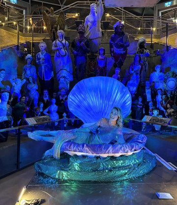 Στο πρόσωπό της, η Μαριέττα Χρουσαλά είχε κολλήσει μικρούς ψεύτικους αστερίες και είχε βάλει γκλίτερ, ενώ τα σκουλαρίκια της, παρέπεμπαν επίσης στον ωκεανό.