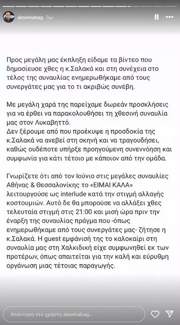 Στην πρώτη του ανάρτηση αναφέρει: «Προς μεγάλη μας έκπληξη είδαμε τα βίντεο που δημοσίευσε χθες η κα. Σαλακά και στη συνέχεια, στο τέλος της συναυλίας, ενημερωθήκαμε από τους συνεργάτες μας για το τι ακριβώς συνέβη. Με μεγάλη χαρά της παρείχαμε δωρεάν προσκλήσεις για να έρθει να παρακολουθήσει τη χθεσινή μας συναυλία στον Λυκαβηττό. Δεν ξέρουμε από που προέκυψε η προσδοκία της κα. Σαλακά να ανέβει στη σκηνή και να τραγουδήσει, καθώς ουδέποτε υπήρξε προηγούμενη συνεννόηση και συμφωνία για κάτι τέτοιο με κάποιον από την ομάδα.
