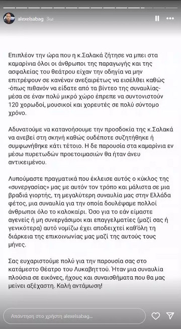 Στη δεύτερη ανάρτηση προσθέτει: «Επιπλέον την ώρα που η κα. Σαλακά ζήτησε να μπει στα καμαρίνια, όλοι οι άνθρωποι της παραγωγής και της ασφάλειας του θεάτρου είχαν την οδηγία να μην επιτρέψουν σε κανέναν ανεξαιρέτως να εισέλθει καθώς – όπως πιθανόν να είδατε από τα βίντεο της συναυλίας – μέσα σε έναν πολύ μικρό χώρο έπρεπε να συντονιστούν 120 χορωδοί, μουσικοί και χορευτές σε πολύ σύντομο χρόνο. Αδυνατούμε να κατανοήσουμε την προσδοκία της κα. Σαλακά να ανέβει στη σκηνή καθώς ουδέποτε συζητήθηκε ή συμφωνήθηκε κάτι τέτοιο. Η δε παρουσία στα καμαρίνια, εν μέσω πυρετωδών προετοιμασιών, θα ήταν άνευ αντικειμένου.