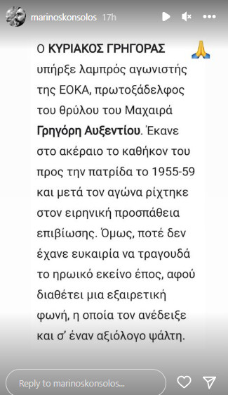 «Ο Κυριακός Γρηγοράς υπήρξε λαμπρός αγωνιστής της ΕΟΚΑ, πρωτεξάδελφος του θρύλου του Μαχαιρά Γρηγόρη Αυξεντίου. Έκανε στο ακέραιο το καθήκον του προς την πατρίδα το 1955-59 και μετά τον αγώνα ρίχτηκε στον ειρηνική προσπάθεια επιβίωσης. Όμως, ποτέ δεν έχανε ευκαιρία να τραγουδά το ηρωικό εκείνο έπος, αφού διαθέτει μια εξαιρετική φωνή, η οποία τον ανέδειξε και σ’ έναν αξιόλογο ψάλτη», έγραφε η ανάρτησή του.