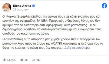 Αναλυτικά, αναφέρει: «Ο Μάρκος Σεφερλής κέρδισε την αγωγή που είχε κάνει εναντίον μου και εναντίον της εφημερίδας ΤΑ ΝΕΑ. Προφανώς ο δημόσιος λόγος του δεν κρίθηκε από το δικαστήριο ούτε ομοφοβικός, ούτε ρατσιστικός. Οι δε δημοσιογράφοι δεν μπορούν πλέον να εκφράζουν ελεύθερα τη γνώμη τους και να στηλιτεύουν τα κακώς κειμενα. Αντίθετα οφείλουν να αυτολογοκρίνονται μην και ενοχλήσουν τους οπαδούς του κακοποιητικου λόγου.