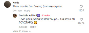 “Είναι που δεν θα έδειχνες ξανά σχέση σου” ήταν το σχόλιο ενώ το μοντέλο απάντησε: “Ξένια μου, ξέχασα να σου πω ρε. Θα κάνω ότι γουστάρω!”.