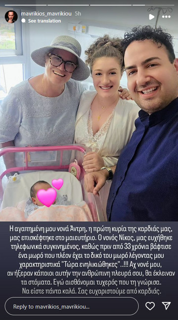 Μάλιστα, πολλά από τα αγαπημένα πρόσωπα του ζευγαριού πήγαν στην κλινική που βρίσκεται το ζευγάρι τις τελευταίες ημέρες για να τους ευχηθούν από κοντά και να γνωρίσουν την Ιωάννα Μελωδία. Ανάμεσά τους και η νονά του Μαυρίκιου, η κυρία Άντρη Αναστασιάδη!