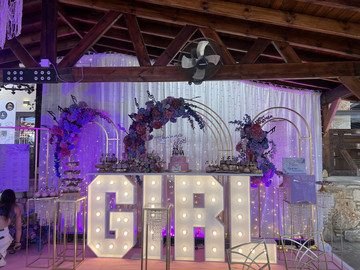 Τα τραπέζια ήταν στρωμένα με ροζ τραπεζομάντηλα και διακοσμούνταν με μουσικές νότες και πιάνα. Επιπλέον μπροστά από το candy table υπήρχε μια μεγάλη επιγραφή “GIRL” με φωτεινά γράμματα.