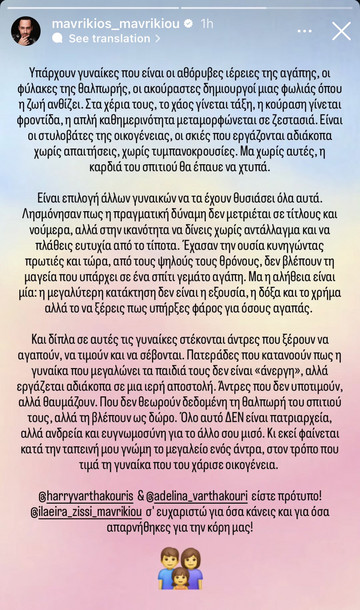 Ο Μαυρίκιος Μαυρικίου, θέλοντας να εκφράσει την υποστήριξή του, προχώρησε σε μία μακροσκελή ανάρτηση στο Instagram, εκφράζοντας τον θαυμασμό του για το ζεύγος Βαρθακούρη και το παράδειγμά τους.