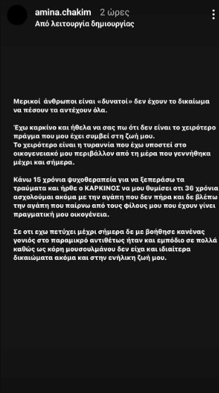 «Μερικοί άνθρωποι είναι “δυνατοί” δεν έχουν το δικαίωμα να πέσουν, τα αντέχουν όλα. Έχω καρκίνο και ήθελα να σας πω ότι δεν είναι το χειρότερο πράγμα που μου έχει συμβεί στη ζωή μου. Το χειρότερο είναι η τυραννία που έχω υποστεί στο οικογενειακό μου περιβάλλον από την μέρα που γεννήθηκα μέχρι και σήμερα. Κάνω 15 χρόνια ψυχοθεραπεία για να ξεπεράσω τα τραύματα και ήρθε ο καρκίνος να μου θυμίσει ότι 36 χρόνια ασχολούμαι ακόμα με την αγάπη που δεν πήρα και δεν βλέπω την αγάπη που παίρνω από τους φίλους μου που έχουν γίνει πραγματική μου οικογένεια. Σε ότι έχω πετύχει μέχρι σήμερα δεν με βοήθησε κανένας γονιός στο παραμικρό. Αντιθέτως ήταν και εμπόδιο σε πολλά, καθώς ως κόρη μουσουλμάνου δεν είχα και ιδιαίτερα δικαιώματα ακόμα και στην ενήλικη ζωή μου.