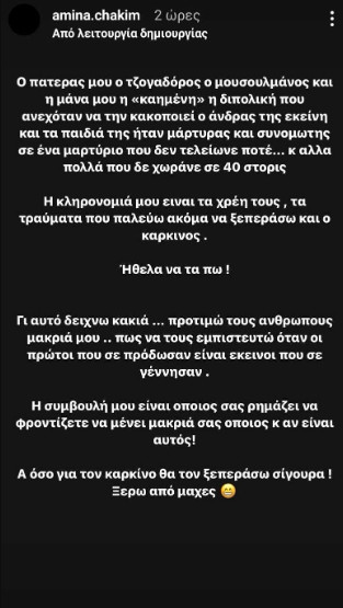 Γι’ αυτό δείχνω κακιά.. προτιμώ τους ανθρώπους μακριά μου..πως να τους εμπιστευτώ όταν οι πρώτοι που σε πρόδωσαν είναι εκείνοι που σε γέννησαν. Η συμβουλή μου είναι όποιος σας ρημάζει να φροντίζετε να μένει μακριά σας όποιος κι αν είναι αυτός! Α όσο για τον καρκίνο θα τον ξεπεράσω σίγουρα. Ξέρω από μάχες», μοιράστηκε η Αμίνα Χακίμ.
