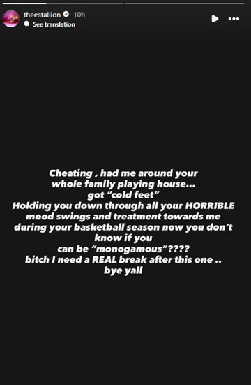 «Σε στήριξα σε όλες τις τρομερές εναλλαγές διάθεσης και τη συμπεριφορά σου απέναντί μου κατά τη διάρκεια της μπασκετικής σεζόν σου, και τώρα δεν ξέρεις αν μπορείς να είσαι “μονογαμικός”; Θέλω ένα πραγματικό διάλειμμα μετά από αυτό, γεια σας», συνέχισε.