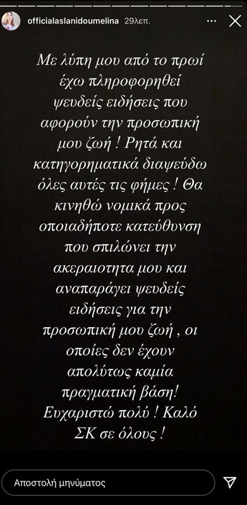 «Σχετικά με την σημερινή ανάρτηση δηλώνω ότι διαψεύδω όσα γράφτηκαν για δήθεν σχέση με την Κ ΑΣΛΑΝΙΔΟΥ και ότι θα κινηθώ νομικά εναντίον όποιου αναπαράγει τις ψευδείς αυτές ειδήσεις».