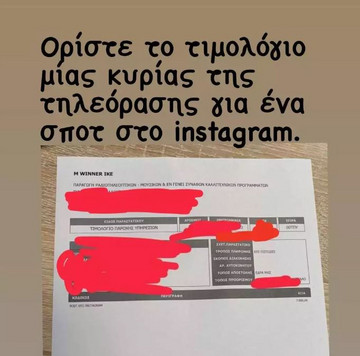 Ο Τριανταφυλλόπουλος έκρυψε το όνομα της παρουσιάστριας, σχολιάζοντας «ορίστε το τιμολόγιο μίας κυρίας της τηλεόρασης για ένα σποτ στο instagram. εταιρία με ρούχα ο πελάτης. Με 8680 ευρώ πώς να μην έχει πάντα δίκιο», ωστόσο δεν έκρυψε την επωνυμία της επιχείρησης στην κορυφή του εγγράφου.