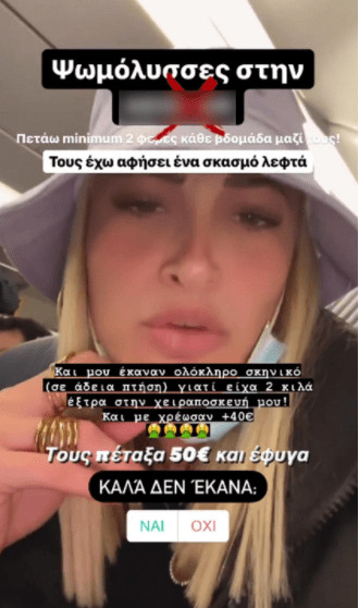 Όπως εξήγηση, η χειραποσκευή της βγήκε υπέρβαρη δυο κιλά και της ζήτησαν 40€ και εκείνη τόνισε ότι τους πέταξε 50€ και έφυγε.